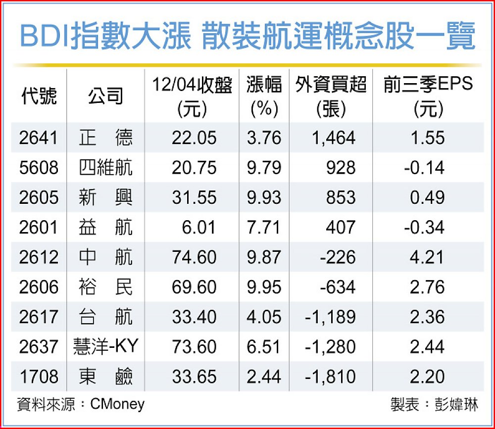 在供需失衡下,代表散裝航運產業景氣指標的波羅的海乾散貨指數(BDI)本周三個交易日上漲11.32%、今年以來已經大漲185.36%,專家認為在北美穀物旺季、西非西芒度鐵礦開出新礦場,散裝航運運力不足問題短期內難以解決;使得新興(2605)、裕民(2606)、中航(2612)、四維航(5608)、裕民(2606)4日攻上漲停板,慧洋-KY(2637)早盤也一度亮燈。