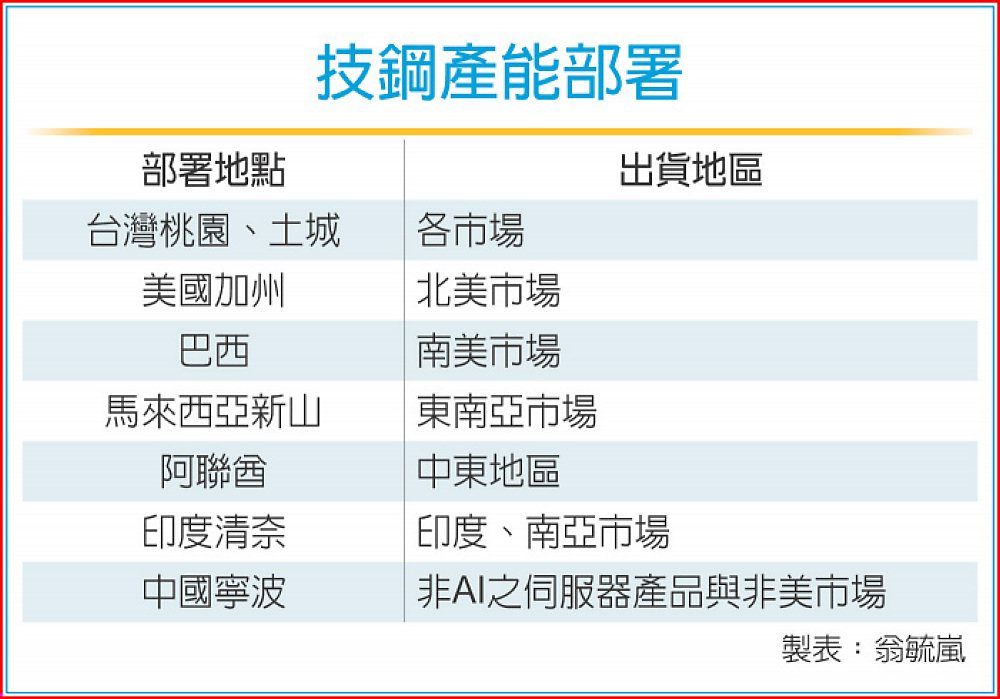 技鋼近一年擴展海外產能部署,除美國加州、馬來西亞新山新擴產線皆已上線,今年接續在巴西、阿聯酋及印度等國家,與在地供應鏈夥伴合作,完備其伺服器在海外多元生產出貨之量能。