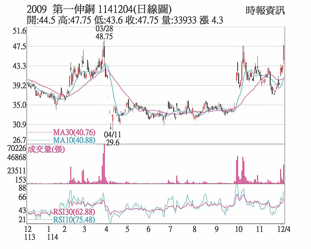 第一銅(2009)受惠於國際銅價強勢飆升,4日股價亮燈漲停收47.75元,改寫近八個多月來新高,成交量放大至3.37萬張,強勢表態多頭格局。各國太陽能、風力發電與儲能系統的建設,對銅線纜及銅排的需求增長,電動車的充電基礎設施也為銅材應用創造龐大市場缺口,高導電性、高散熱效率的銅材更是AI數據中心不可或缺的原物料,推升國際銅價一路走高。