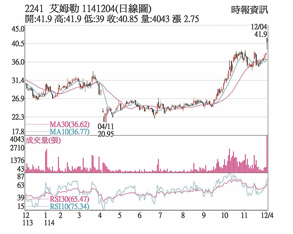 艾姆勒(2241)4日股價以41.9元開高,終場收40.85元,上漲7.22%,單日成交量擴大至4,021張,站穩短中長期均線之上,且各均線呈現上揚態勢,周KD並出現黃金交叉,惟在連續三個紅K後,出現黑K留長下影線,需注意多空拉鋸震盪風險。