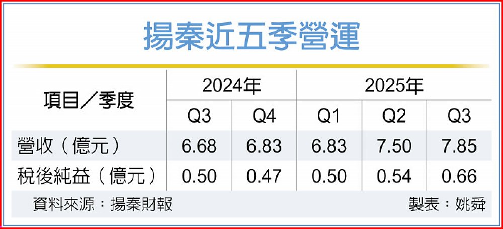 揚秦今年第三季受惠於暑期餐飲業消費升溫和外食動能強勁,並在展店效益助攻下,營收與獲利接連創單季新高紀錄,同時毛利率、營益率、淨利率均較去年同期提升,繳出「三率三升」佳績,第三季每股稅後純益(EPS)1.80元。前三季營收及獲利均創上櫃以來新高,EPS達4.67元。