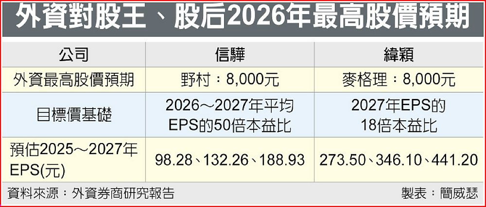 此外,兩大高價領頭羊目標價雖均為8,000元,但信驊隸屬AI半導體、緯穎為下游硬體,市場賦予的本益比自然有所差異。野村證券給予信驊的8,000元推測合理股價,乃是建立在2026~2027年平均每股稅後純益(EPS)及歷史區間的中間值50倍本益比;麥格理賦予緯穎8,000元股價預期則是基於2027年EPS的本益比18倍所推估。(相關新聞見A3)
