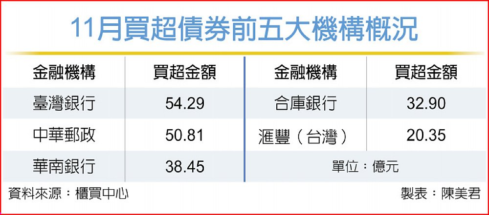 11月買債前十大機構還包括,外商滙豐(台灣)銀行、中國信託銀行、華泰銀行、國際票券、遠東銀行與新光銀行,買超規模介於10億元至20.35億元之間。