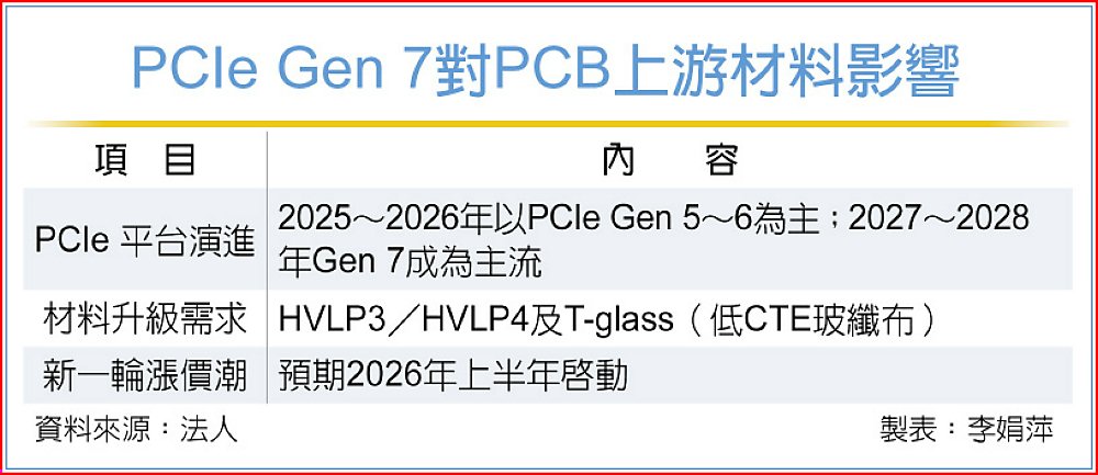 AI伺服器平台升級腳步加快,PCIe Gen 7預計自2027~2028年起成為主流,帶動伺服器主板規格大幅提升。法人指出,高速傳輸需求推升PCB材料全面升級,HVLP銅箔與T-glass(低CTE玻纖布)供應吃緊,下一輪漲價潮,有機會於2026年上半年啟動。