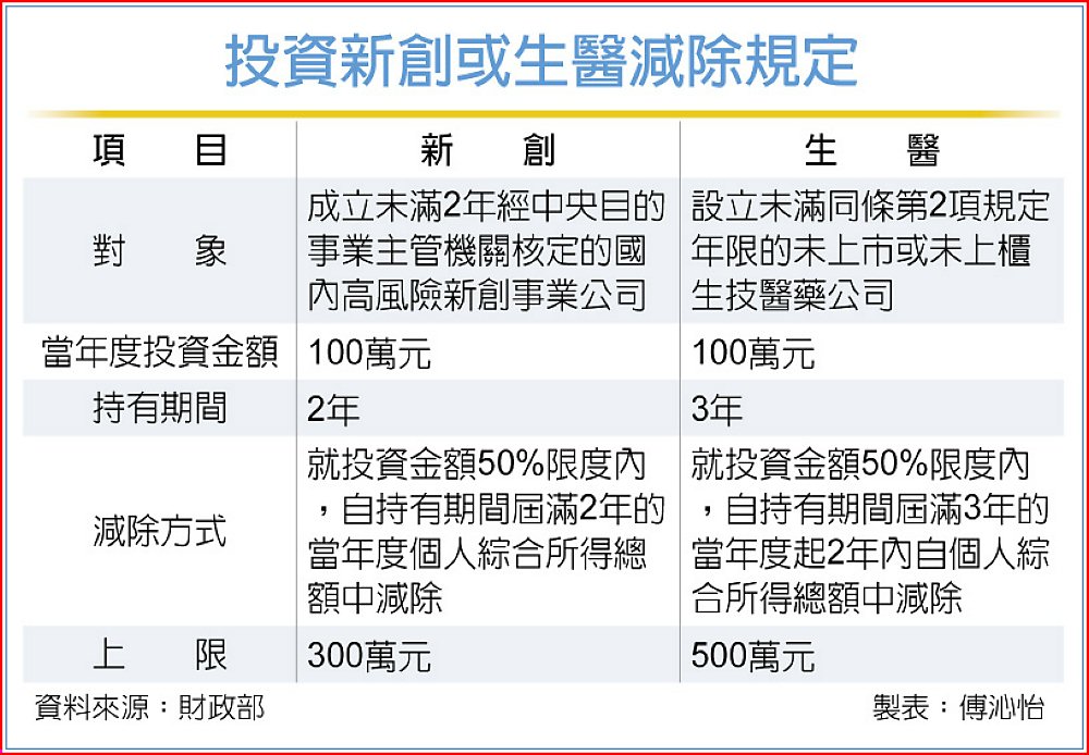 財政部表示,這類投資生醫新創者,可在投資金額50%限度內,自持有期間屆滿3年的當年度起2年內自個人綜合所得總額減除,個人每年可減除金額合計以500萬元為限。