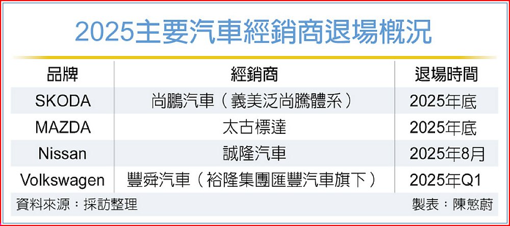 進口車市今年遭受關稅不確定性重擊買氣,經銷商營運環境急速惡化,棄守潮一波接一波。繼馬自達(MAZDA)與重量級經銷商太古標達無預警宣布結束合作,震撼彈再添一樁。義美集團汽車事業的尚鵬汽車,也確定將在今年底終止與SKODA長達九年的經銷合作,再度凸顯經銷商在母廠高成長目標與市場低迷夾擊下難以為繼的產業現象。