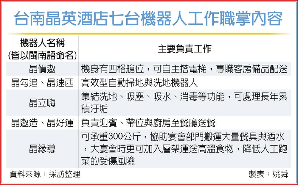 台南晶英總經理李靖文表示,透過人與機器人共學與共創,台南晶英酒店將走向「AI旅宿實驗學院」,開啟飯店服務嶄新模式,以「HRC(人機協作)」為目標,召集客房、餐飲、人資與公清等單位成立跨部門小組,全面檢討並評估任務屬性、動線設計與作業流程,然後導入7台不同功能智慧機器人支援飯店營運。
