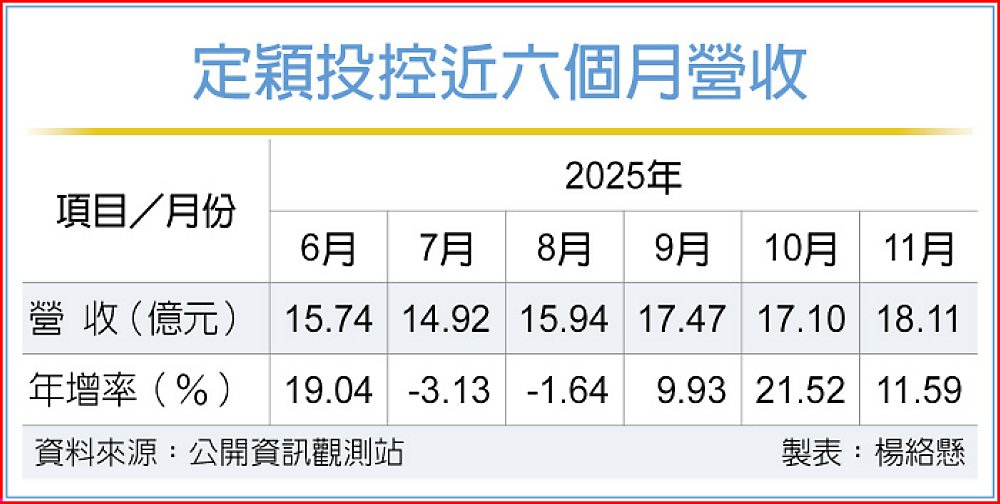 定穎投控(3715)11月營收18.11億元,月增5.91%、年增11.59%,創單月歷史新高;累計前11月營收175.35億元、年增8.38%,距去年全年僅差1.93億元,營運動能維持高檔,預期將刷新歷年最佳紀錄。儘管定穎短期仍以既有產品線支撐為主,但隨AI專案推進及泰國新產能在2026年逐季開出,中期成長架構已更趨明確。