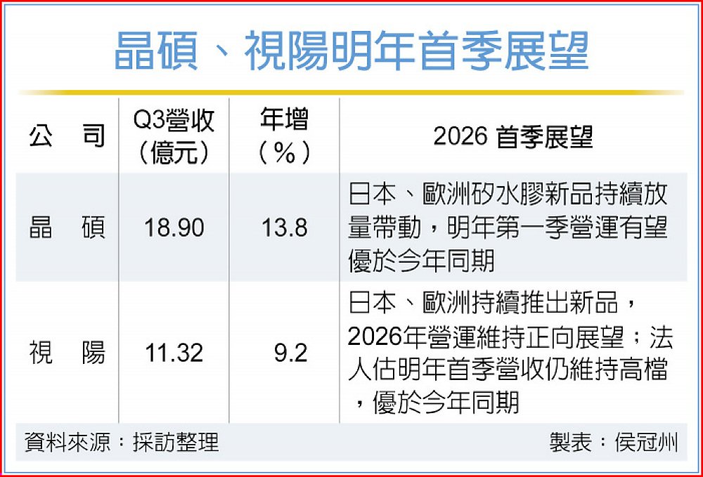 為搶占矽水膠商機,晶碩(6491)、視陽(6782)兩大隱形眼鏡業者續擴產能。晶碩主要生產矽水膠產品的大溪廠現月產1,000萬片,2026年上半年將提升至1,500萬片,明年底前達2,000萬片,而視陽目前整體產能稼動率維持逾90%超過一年,第四季擴產後月產能達4,900萬片,明年第三季預計再增加300萬片。