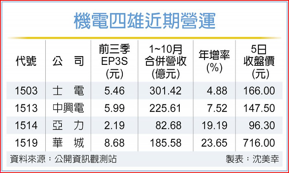 受惠於台電強韌電網計畫持續釋單,機電四雄今年前十月營收均創同期新高,訂單能見度全看到2028年。