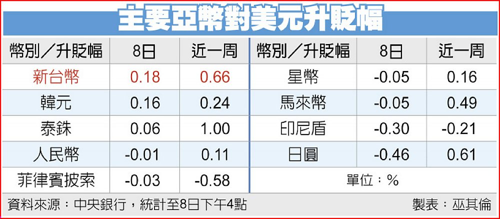上周美國公布通膨數據略低市場預期,美元回落加上台股續強,新台幣匯率突破盤整區間。8日整體亞幣中,新台幣升值0.18%最強,韓元上漲0.16%、人民幣小貶0.01%、日圓大跌0.46%。