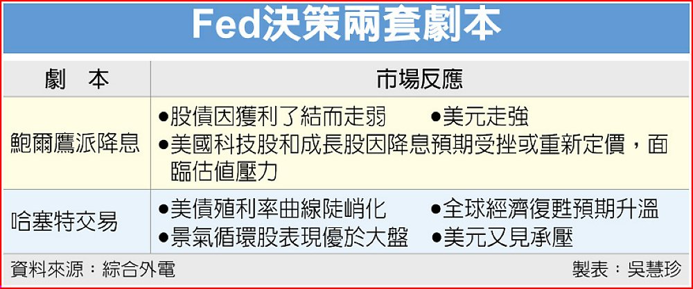 美國聯準會(Fed)本周發布今年最後一次政策聲明,華爾街擬好兩套劇本,可能形成「鷹派降息」對決「哈塞特交易」的局面,就看市場如何反應。若市場對「鷹派降息」較敏感,預料出現股債走弱及美元走強;市場對「哈塞特交易」埋單的話,將見美債殖利率曲線陡峭化和美元承壓。