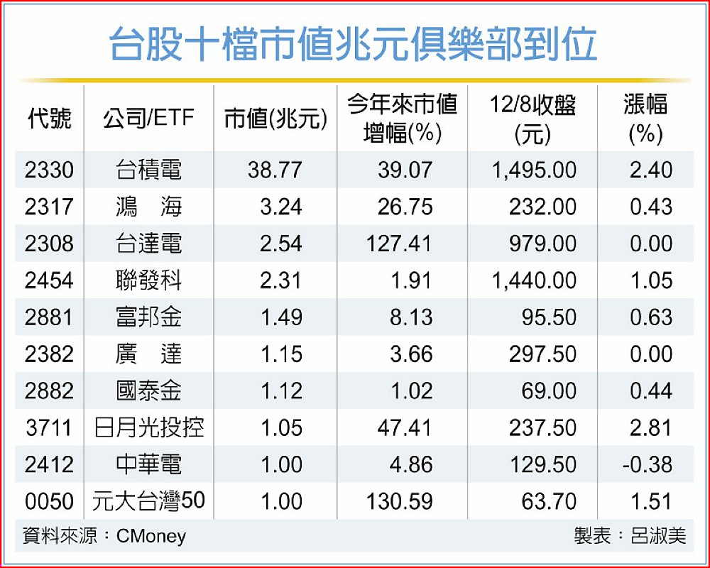 據統計,台股逾兆元大軍原有九檔,依序為台積電、鴻海、台達電、聯發科、富邦金、廣達、國泰金、日月光投控及中華電等刷新九檔市值衝上兆元新紀錄,兆元大軍幾乎集中在AI權值股及兩大壽險金控雙雄。元大台灣50在台積電帶動下,市值8日衝上1兆元之上,為首檔ETF市值破兆元新紀錄,再寫台股新里程碑。