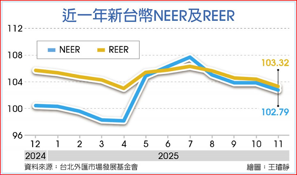 央行統計,11月美元指數下跌0.35%,新台幣全月重貶1.98%,直接反映在11月新台幣NEER、REER走低,均為5月以來新低。NEER為估算一國貨幣對一籃子外國貨幣的匯率變動,未排除物價變動影響,主要就是代表在計算期間,一國貨幣匯率的變動幅度;市場更注意的是攸關出口報價競爭力的REER,從7月高點106.24回降,11月降至103.32,11月底新台幣匯率逼近31.5元,廠商壓力相對緩解,但後續升值壓力山雨欲來,廠商並未鬆懈。