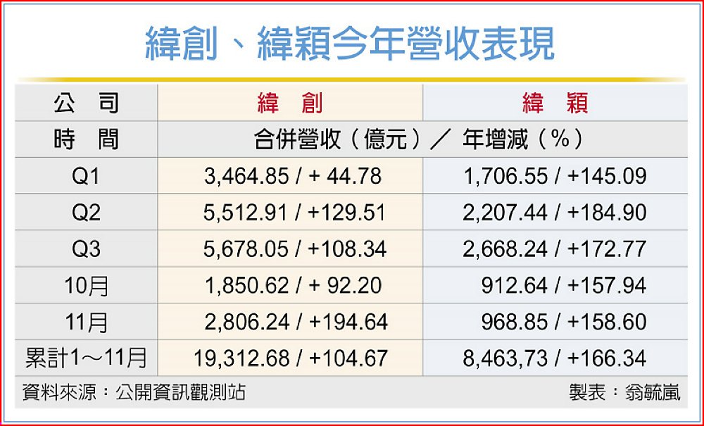 緯穎近兩季受惠AWS自研ASIC專案出貨帶動,業績持續攀高,11月營收年、月雙增、以968.85億元寫下歷史新猷,累計前11月營收年增翻倍、達8,463.73億元、續創新高。