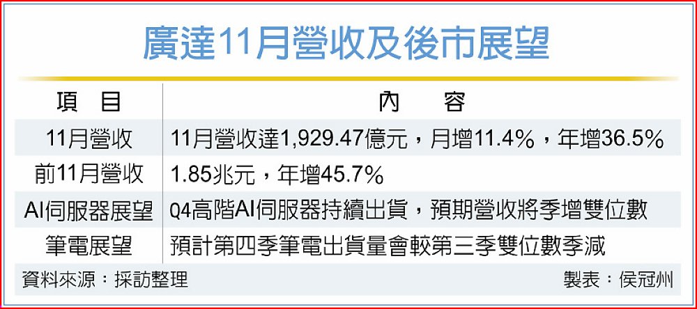 AI伺服器穩定出貨,挹注廣達11月營收續寫佳績。廣達11月營收1,929.47億元,月增11.4%,較去年同期大幅增加36.5%,寫單月歷史新高;今年前11個月營收為1.85兆元,年增45.7%。廣達指出,第四季高階AI伺服器持續出貨,預期AI伺服器營收將季增雙位數,並維持先前法說會展望,預期明年AI伺服器營收仍將有三位數的成長,且占整體伺服器營收將達8成。