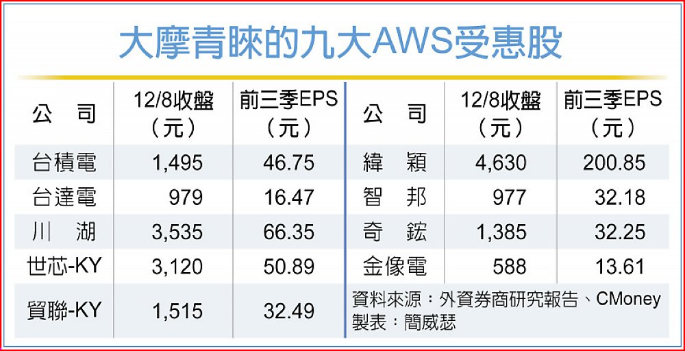 根據摩根士丹利證券對供應鏈剖析,負責伺服器機櫃組裝的緯穎、連接解決方案的貿聯-KY、PCB供應商金像電、AI加速器模組與網通交換器的智邦、伺服器導軌的川湖、散熱解決方案廠商奇鋐、電源供應器的台達電等,是下游硬體領域最青睞的AWS受惠股;半導體上游則以台積電、世芯-KY最獲看好。