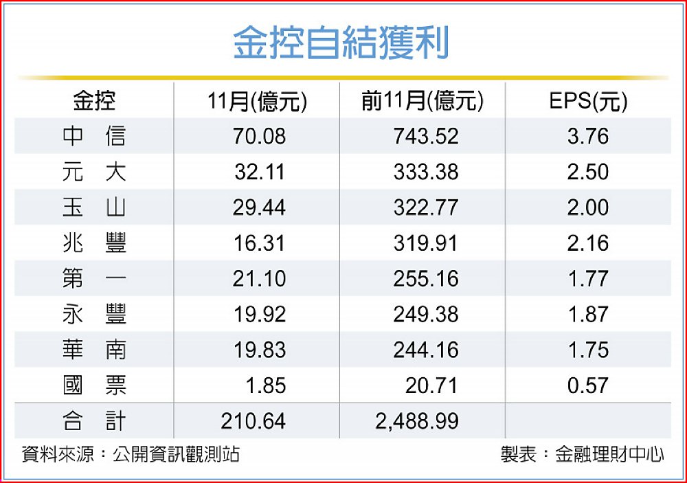 金控11月自結獲利陸續出爐,目前已公布有8家,合計稅後純益210.64億元。前11月合計2,488.99億元,較去年同期年增9.65%,目前中信金前11月獲利突破700億元暫居領先,元大、玉山、兆豐金也破300億元,且與去年同期相比,玉山金獲利成長高達34.47%居冠。