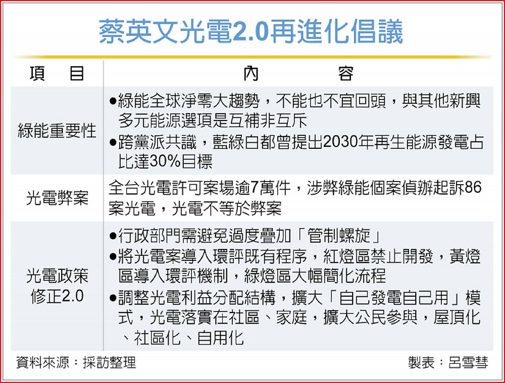 力推綠電的前總統蔡英文日7日臉書表示,若因少數個案使光電產業遭到污名化,進而停止發展綠能,將與全球趨勢背道而馳,扼殺的是台灣共同的經濟利益,同時,政院跨部會盤點,確認2026年光電安裝目標量的案源都已掌握。