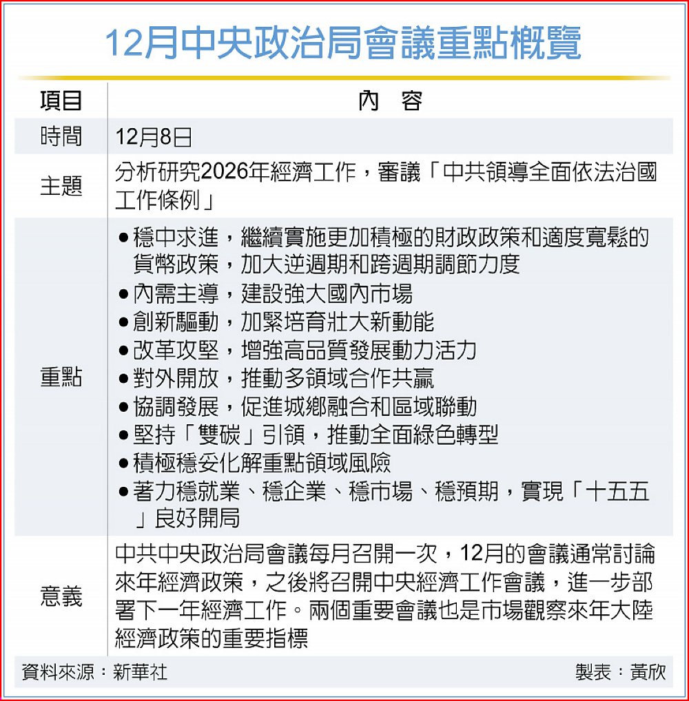 中共中央政治局8日召開會議,分析研究2026年經濟工作。會議提出,明年經濟工作要堅持穩中求進、提質增效,繼續實施更加積極的財政政策和適度寬鬆的貨幣政策,加大逆週期和跨週期調節力度,提升宏觀經濟治理效能。專家認為,據官方表述,明年仍有降準降息可能,預估GDP增長目標續為5%左右。