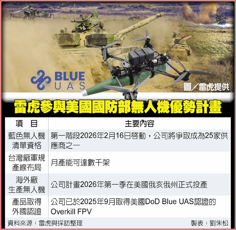 雷虎表示,公司已於2025年9月取得美國DoD Blue UAS認證的Overkill FPV,正是DDP計畫採購類別。