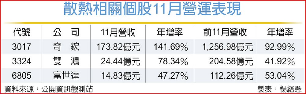 奇鋐11月營收173.82億元,月增5.66%、年增141.69%,連續十個月改寫新高;累計前11月營收1,256.98億元、年增92.99%。據悉,奇鋐為GB300水冷板的主要供應商,並同步推進新一代ASIC平台合作,2026年可望受惠CSP(雲端服務供應商)水冷採用率提升帶動整體產品組合升級。此外,水冷分歧管(Manifold)於GB300與Vera Rubin平台需求同步擴大,將為2026年增添新的營收動能。