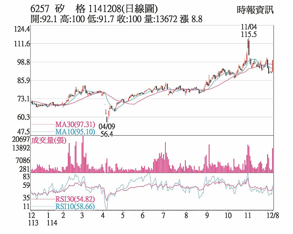 矽格(6257)11月初股價寫下波段高點後,近月拉回整理,上周更失守季線支撐,然僅短短一周,逢低買盤介入,8日該股強攻漲停板以100元收市,股價不僅重回百元,並收復季線關卡,外資單日大買4,425張,在價量具揚且籌碼面有利態勢,後市有機會延伸上漲力道。