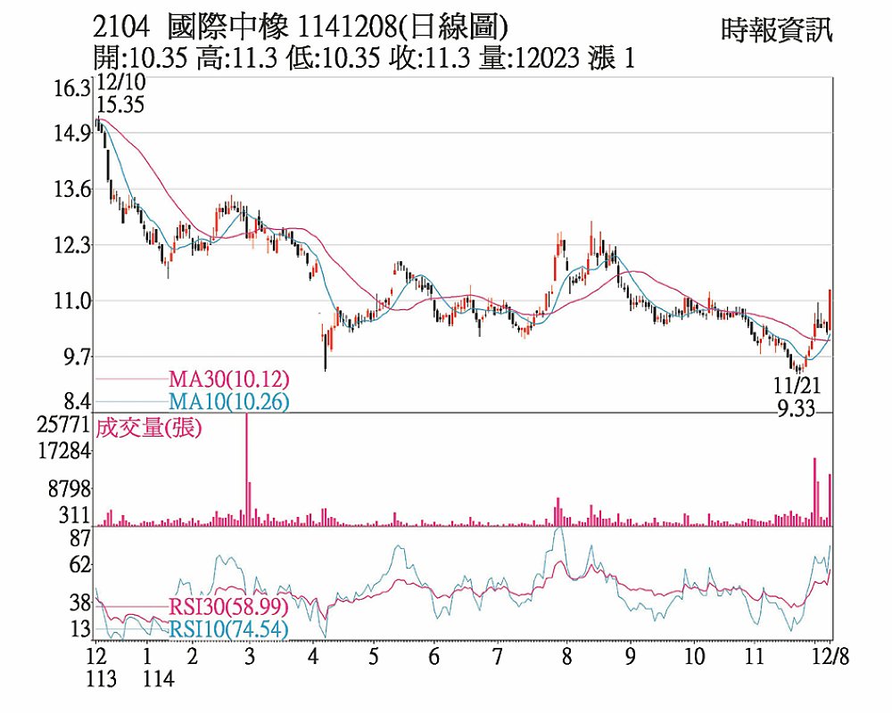 國際中橡(2104)與土耳其OYAK合作新廠明年第四季試產,吸引法人及中長期買盤回籠,8日股價放量強攻,收盤漲停11.30元,突破前波高點11.25元,並站上所有短均線,5日均線已反轉上揚,月、季線趨勢維持往上,9日KD值重新交叉走高;量能逐步放大,各短線技術指標有利多頭,惟今年高點12元之上套牢浮額仍多,往上攻預期震盪將加劇。