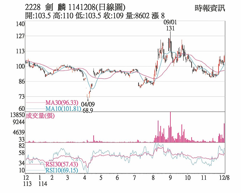 劍麟(2228)受惠散熱題材攻勢續強,8日股價放量走高,盤中一度觸及110元,不過隨即遭遇賣壓,終場收109元,上漲7.92%,成功收復周線,短期均線維持上揚,單日成交量8,540張,外資也在上周連續賣超後轉買超43張,與自營商合計買超130張,後續量能若能維持,有助突破壓力區。