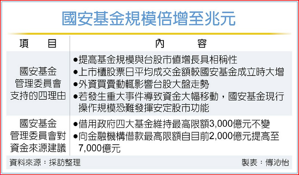 國安基金管理委員會表示,因此針對立委提案依台股規模拉高國安基金額度,表示認同且尊重。針對資金來源的部分,國安基金則強調,考量四大基金主要用以照顧勞工及軍公教人員退休撫卹或儲蓄準備的營運資金,以獲取長期穩定績效、提升基金投資運用效益為目標。