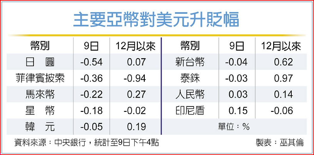 整體亞幣9日普遍走弱,以日圓重挫0.54%最弱,其次菲律賓披索大跌0.36%、馬來幣貶值0.22%、星幣下滑0.18%、韓元貶0.05%、新台幣貶0.04%、泰銖貶0.03%;人民幣則是小升0.03%、印尼盾升值0.15%。