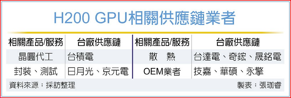 在散熱設計方面,H200的SXM/NVL版本最大TDP落在600W~700W,其中NVL採PCIe雙插槽氣冷形式,台達電、奇鋐、雙鴻等既有輝達散熱供應鏈可沿用現有冷板結構,快速因應量產需求,有機會因中國大陸市場的替代性需求而間接受惠。