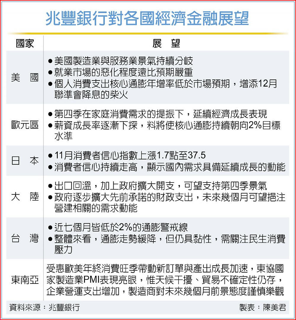兆豐銀行徵信處最新總經報告揭秘,美國製造業與服務業景氣持續分岐;歐元區下半年經濟成長可望優於上半年;日本消費者信心持續好轉;大陸出口回溫,加上政府擴大開支,可望支持第四季景氣。國際主要國家經濟金融湧現「三亮點、一隱憂」。