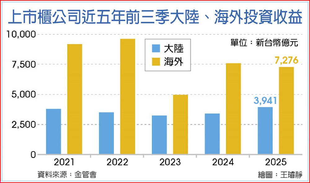 上市櫃公司大陸及海外投資獲利大爆發,金管會公布上市櫃公司今年前三季大陸及海外投資情形,證期局主任秘書王秀玲指出,大陸前三季投資損益,上市公司3,774億元,上櫃公司167億元,合計3,941億元,整體較去年前三季增加530億元或15.54%,與歷年同期相較,獲利創新高紀錄。