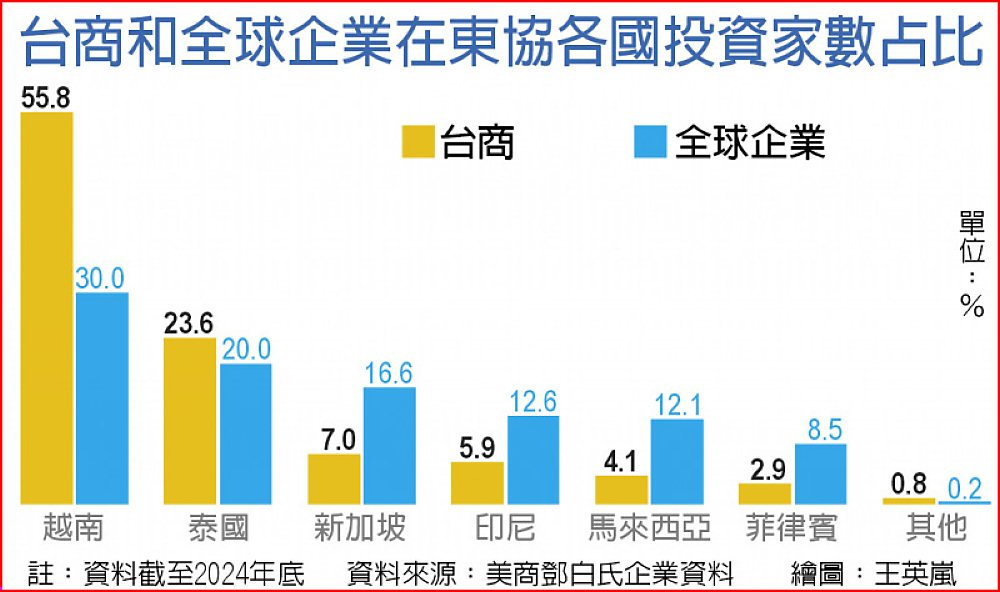 中華經濟研究院台灣東南亞國家協會研究中心和美商鄧白氏台灣分公司9日共同發表《台商在東協投資趨勢調查報告(2018–2024年)》。中華經濟研究院董事長曹添旺表示,這是全國首份以台灣企業實際數據,涵蓋實質受益人結構、股權關係、公司母子關係、品牌關連性等,為基礎的台商在東協投資之調查報告。