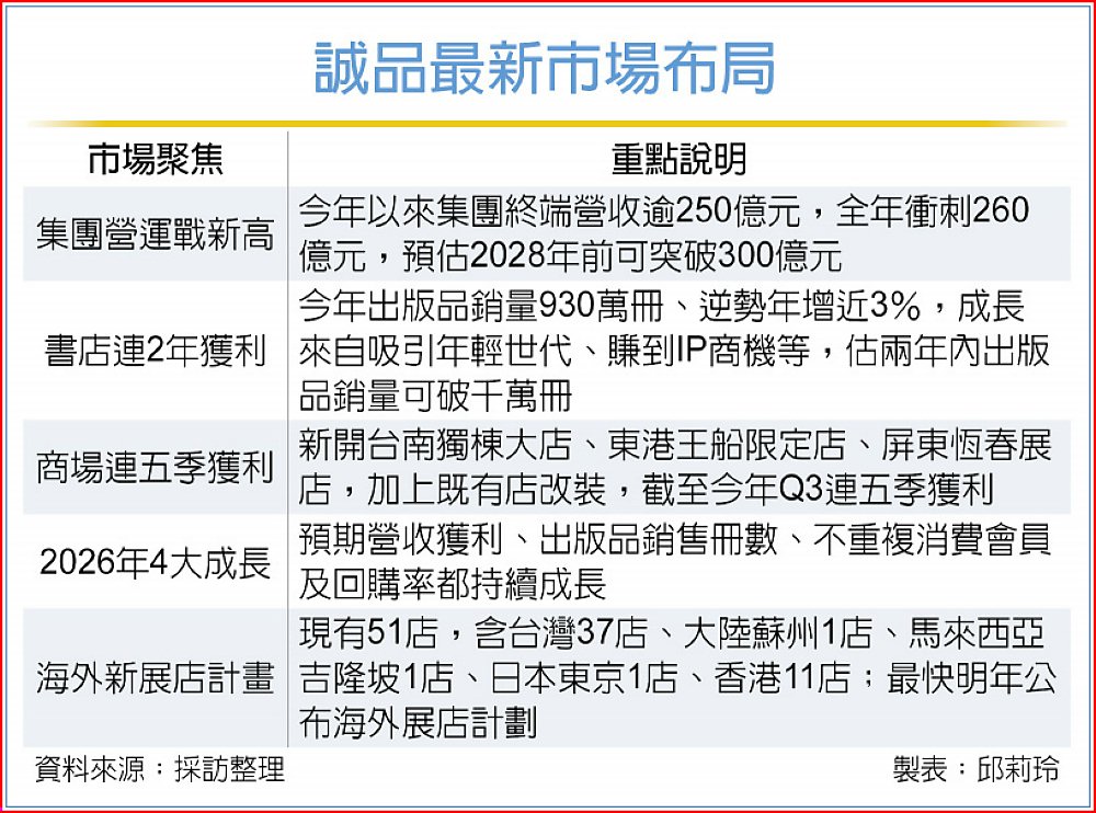 誠品旗下書店與商場連兩年繳出雙「盈」成績單,董事長吳旻潔9日表示,今年以來集團終端營收已超過250億元,全年努力向260億元衝刺,預估2028年以前整體終端營收可突破300億元大關。