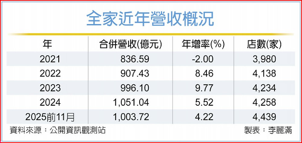 全家便利商店受惠持續展店、線上線下整合搶攻雙11,以及泛鮮食、茶飲銷售成長助攻下,11月合併營收94.35億元、年增7.61%,前11月合併營收1,003.72億元、年增4.22%,單月與累計營收均創同期新高。