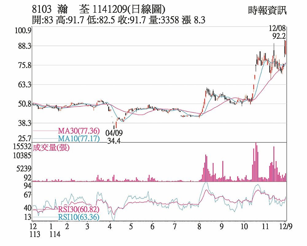 瀚荃(8103)將於12日召開法說,公司定調強攻AI伺服器電源,買盤押寶法說內容樂觀,激勵瀚荃9日攻上漲停板,終場站穩90元整數大關,以91.7元收市,股價逼近前波高點,外資、自營商分別小幅買超198張、61張,目前日KD交叉向上,技術線型有利於多頭。