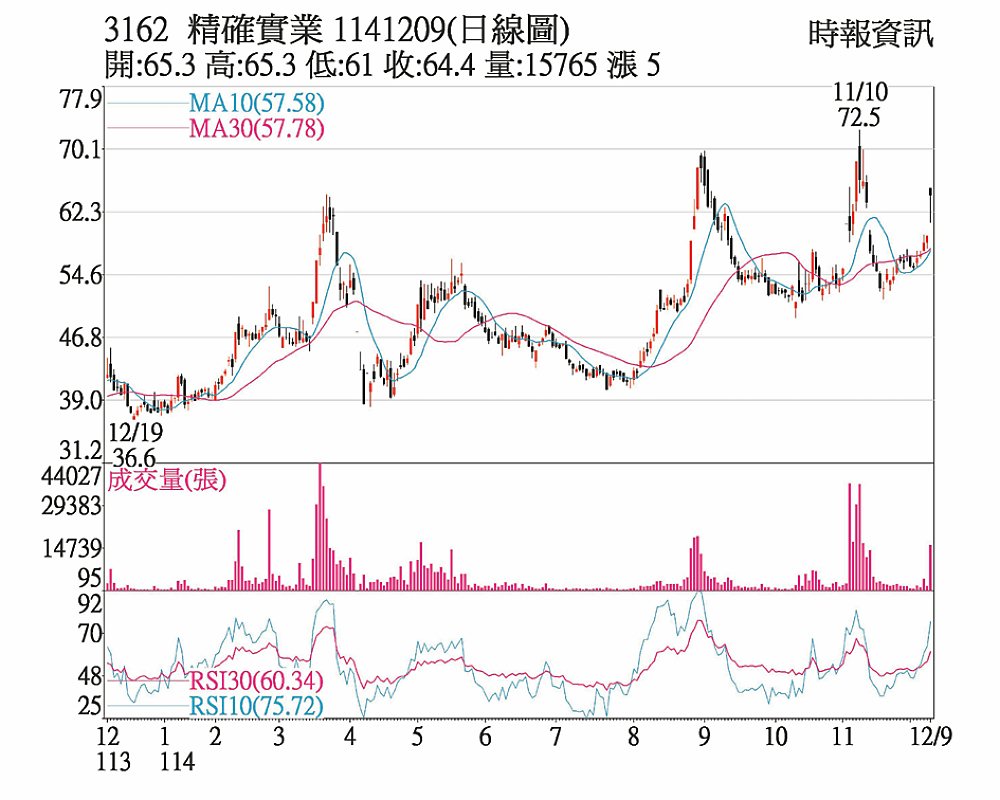 精確(3162)9日開盤即強勢漲停,股價衝上65.3元,雖隨即遭遇獲利賣壓震盪走跌,不過在觸61元後再有買盤進駐,支撐股價向上,終場收64.4元,漲幅仍達8.42%,續站穩短中長期均線之上,KD亦同步走多格局。單日成交量放大至1.57萬張,外資連二日買超,若量能續增溫,有助股價續揚。