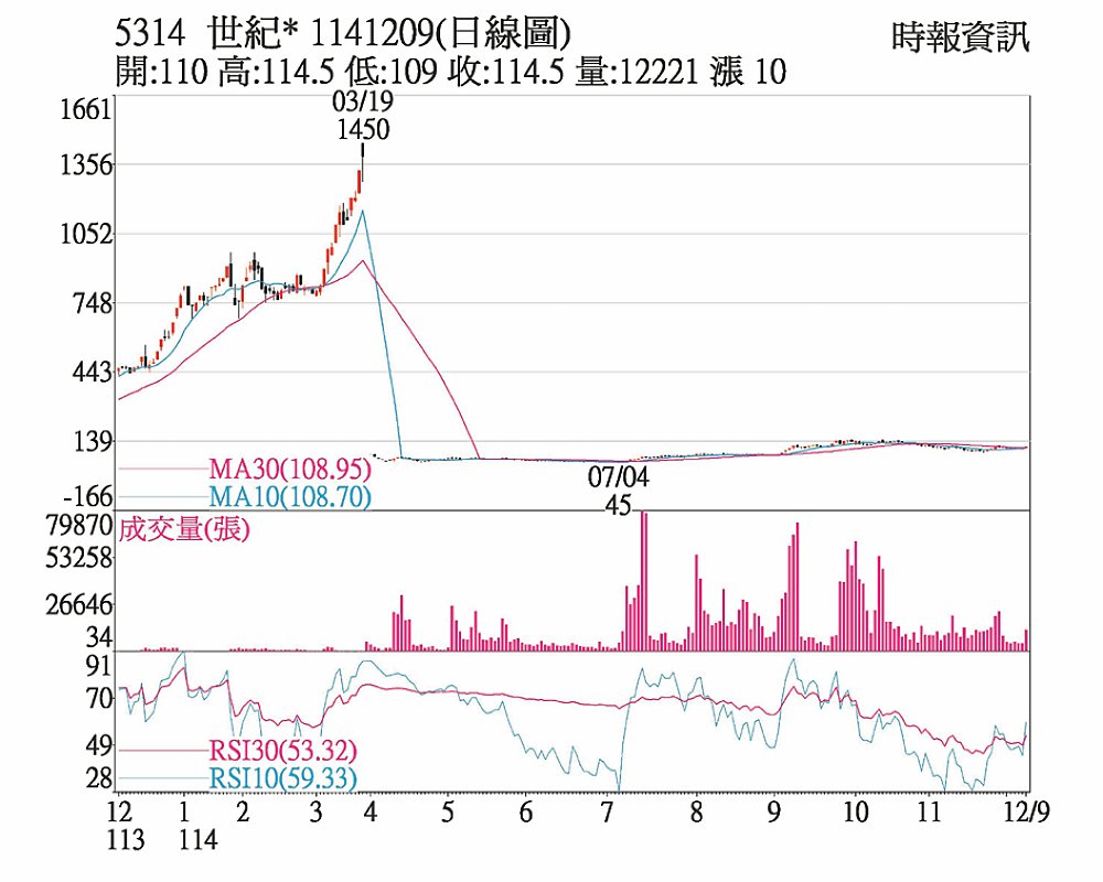 世紀*(5314)因計畫公開收購萬年清股權,開拓水資源商機,9日股價隨特定買盤進拉抬,強勢亮燈漲停,以114.5元收盤,成交量1.21萬張,其中外資買超941張、自營商加碼16張。股價突破106元壓力,短線多空量能由弱轉強。
