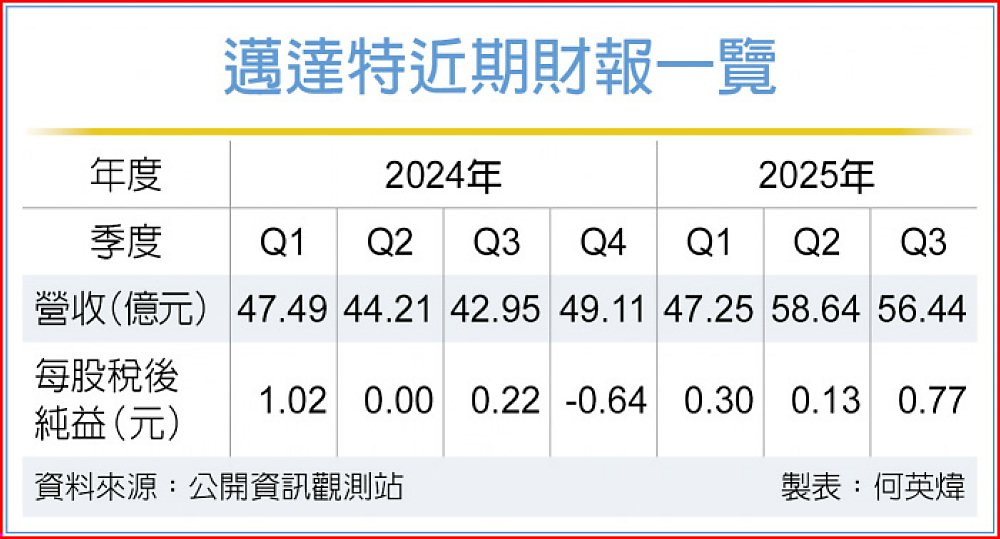 邁達特表示,2025年第三季繳出「進步」成績單,主因海外子公司調整告一段落,單季營收56.44億元,年增31.4%。營業利益1.92億元,稅後純益1.45億元,每股稅後純益0.77元,優於上季的0.13元及去年同期的0.22元。