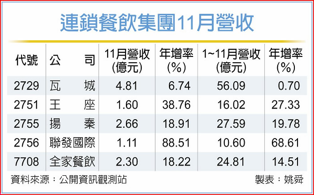 受惠展店效益與年終聚餐和企業尾牙增加,加上普發現金萬元政策紅利帶動外食餐飲商機,瓦城(2729)、王座(2751)、揚秦(2755)、聯發國際(2756)、全家餐飲(7708)等連鎖餐飲集團,11月與前11月營收均創同期新高。