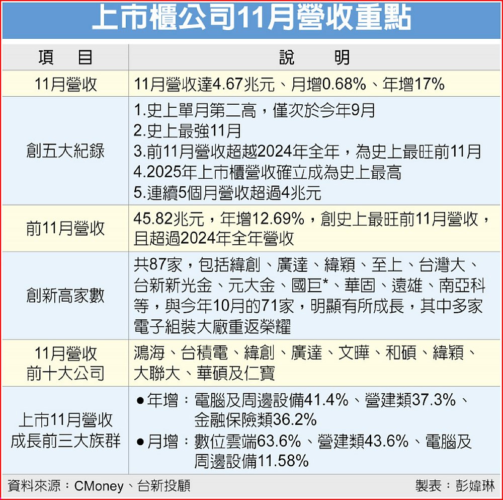上市櫃公司11月營收10日全揭曉,11月單月達4.68兆元,月增0.68%、年增17.01%,創史上單月營收次高紀錄及史上最強11月,差165億元就打敗9月寫下最強的單月營收;且前11月營收達到45.83兆元,年增12.69%,超越單年史上最高營收2024年的44.79兆元,另上市櫃公司首次以前11月合計數,就刷新單年的史上營收最高。