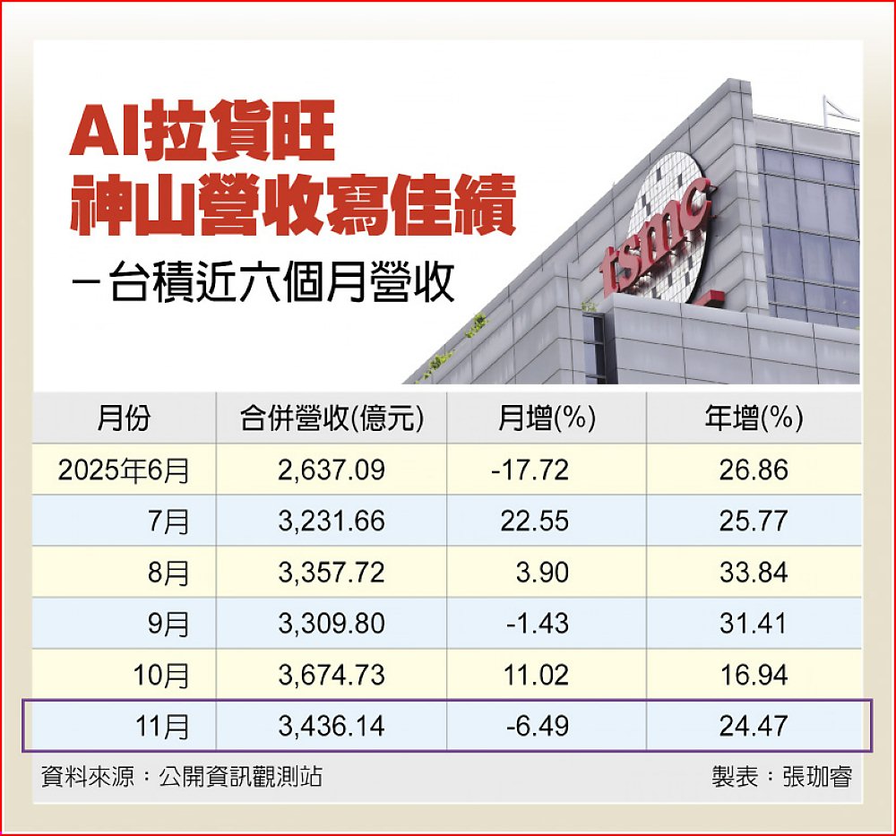 晶圓代工龍頭台積電11月合併營收3,436.14億元,月減6.49%,但在AI晶片強勢拉貨推動下,年增近25%,寫下歷史第三高紀錄。法人指出,全球AI伺服器與資料中心建置持續加速,使台積電先進製程維持滿載,第四季營收上看財測高標,可望叩關單季兆元規模,再度凸顯台積電在全球半導體景氣中的關鍵角色。