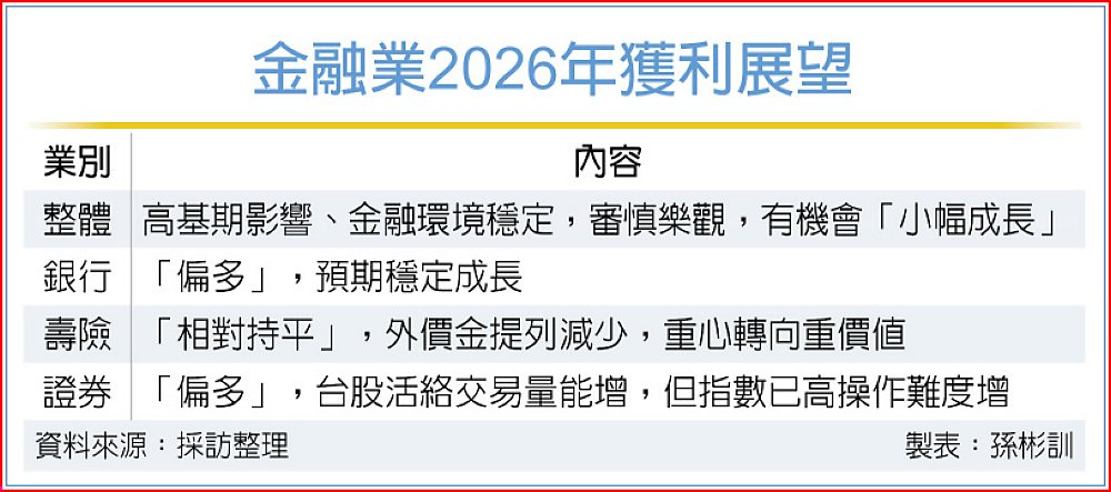 展望2026年表現,公股銀行認為,金融環境仍穩定,有機會「小幅成長」,預估金融三業仍以銀行業獲利相對穩定成長,壽險業外匯價格變動準備金提列減少,但部分壽險公司仍有資本適足率問題,證券業因台股指數已高,操作難度增加,取決於後續發展及影響。