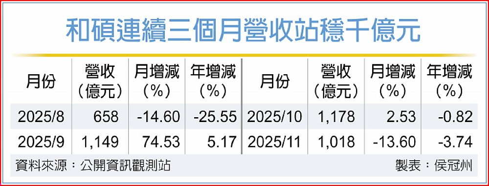 和碩10日公告11月營收,隨時序逐漸進入淡季,和碩11月營收達1,018億元,月減13.6%、年減3.74%,雖呈現年、月雙減但仍站穩千億元關卡;今年前11個月累計營收達1.017兆元,較去年同期略減0.55%。展望後市,和碩維持先前法說會看法,第四季筆電出貨略微季減,但手機、網通等產品第四季出貨有所成長,第四季營收表現將優於第三季。