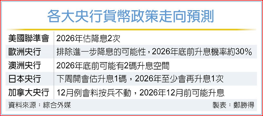 全球金融市場正調整對各國央行貨幣政策的預期,愈來愈多交易員押注歐洲、加拿大與澳洲等國可能停止貨幣寬鬆、甚至轉向升息。這將令美國聯準會(Fed)降低借貸成本的舉措成為主要經濟體裡的「異類」,2026年可能是唯一降息的主要央行。