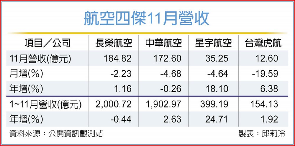 長榮航11月合併營收184.82億元,月減2.23%、年增1.16%,寫同期新高,其中客運營收110.91億元、貨運營收51.18億元;前11月合併營收2,000.72億元、年減0.44%。