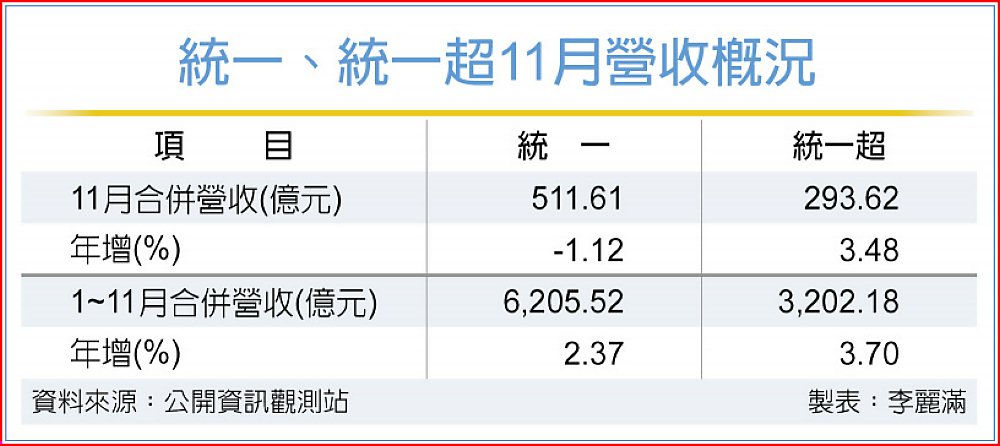 統一集團頂樑柱統一超商,則受惠本業與轉投資事業,包括菲律賓7-ELEVEN、統一生活、統一資訊、二十一世紀、統一百華等業績同步成長,11月合併營收達293.62億元、年增3.48%,前11月合併營收3,202.18億元、年增3.70%,單月與累計營收均創同期新高。