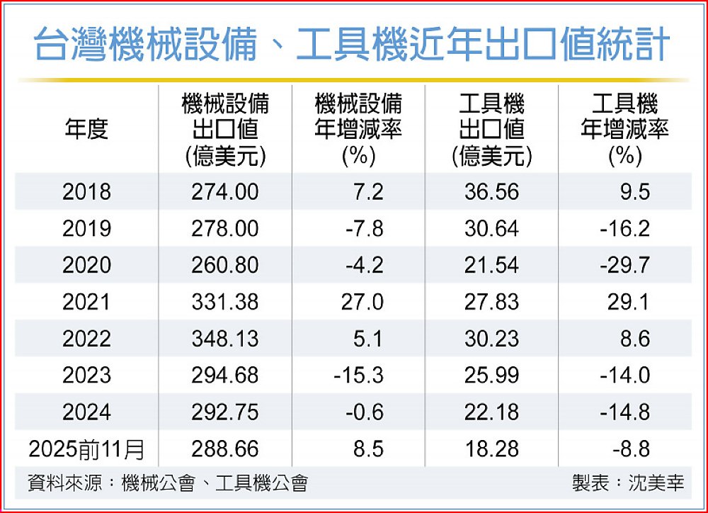 至於工具機11月出口值持續較去年同期衰退,其中對美國出口值年減27.7%,對中國大陸出口值也年減12.6%,主要受市場需求動能不足、新台幣匯率較對手國強勢影響,預計全年工具機出口值僅約20億美元,產業營運面臨巨大挑戰。